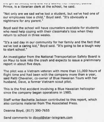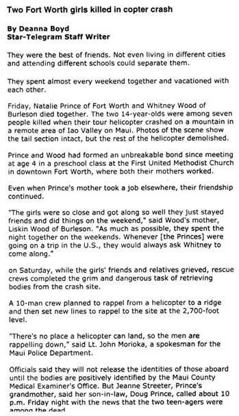 "Two Fort Worth girls killed in 'copter crash" Fort Worth Star-Telegram, July 22, 2000